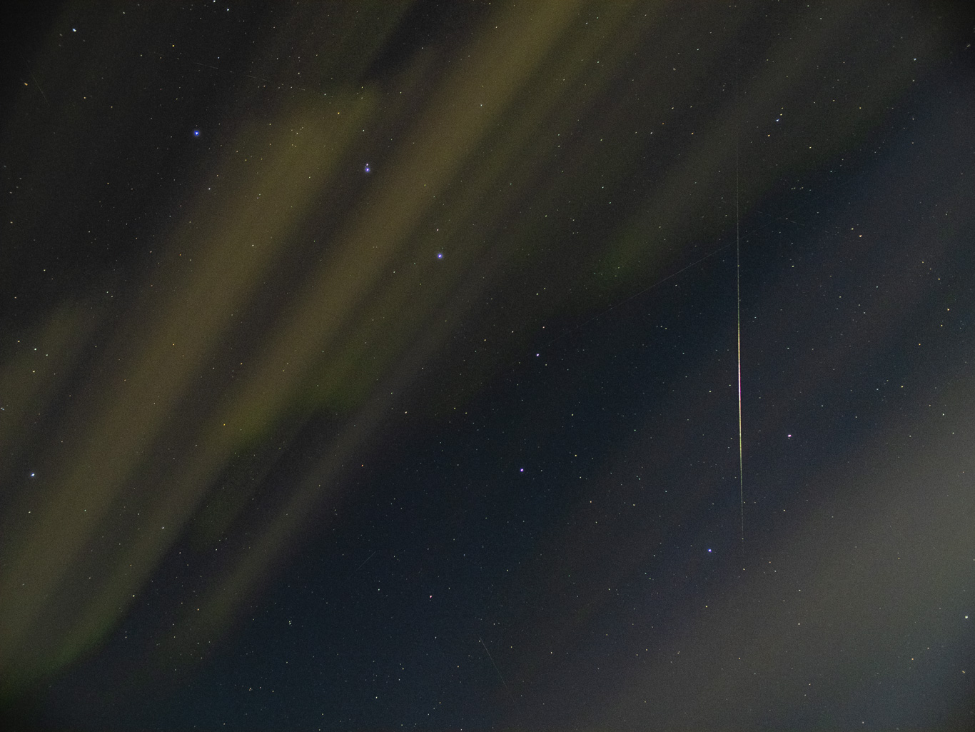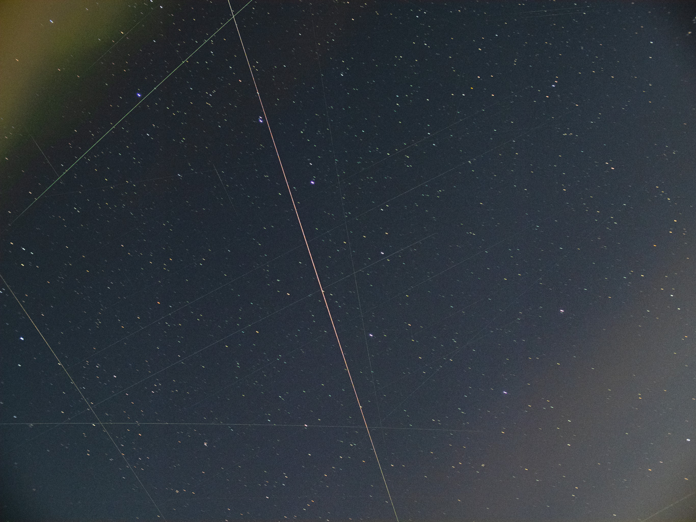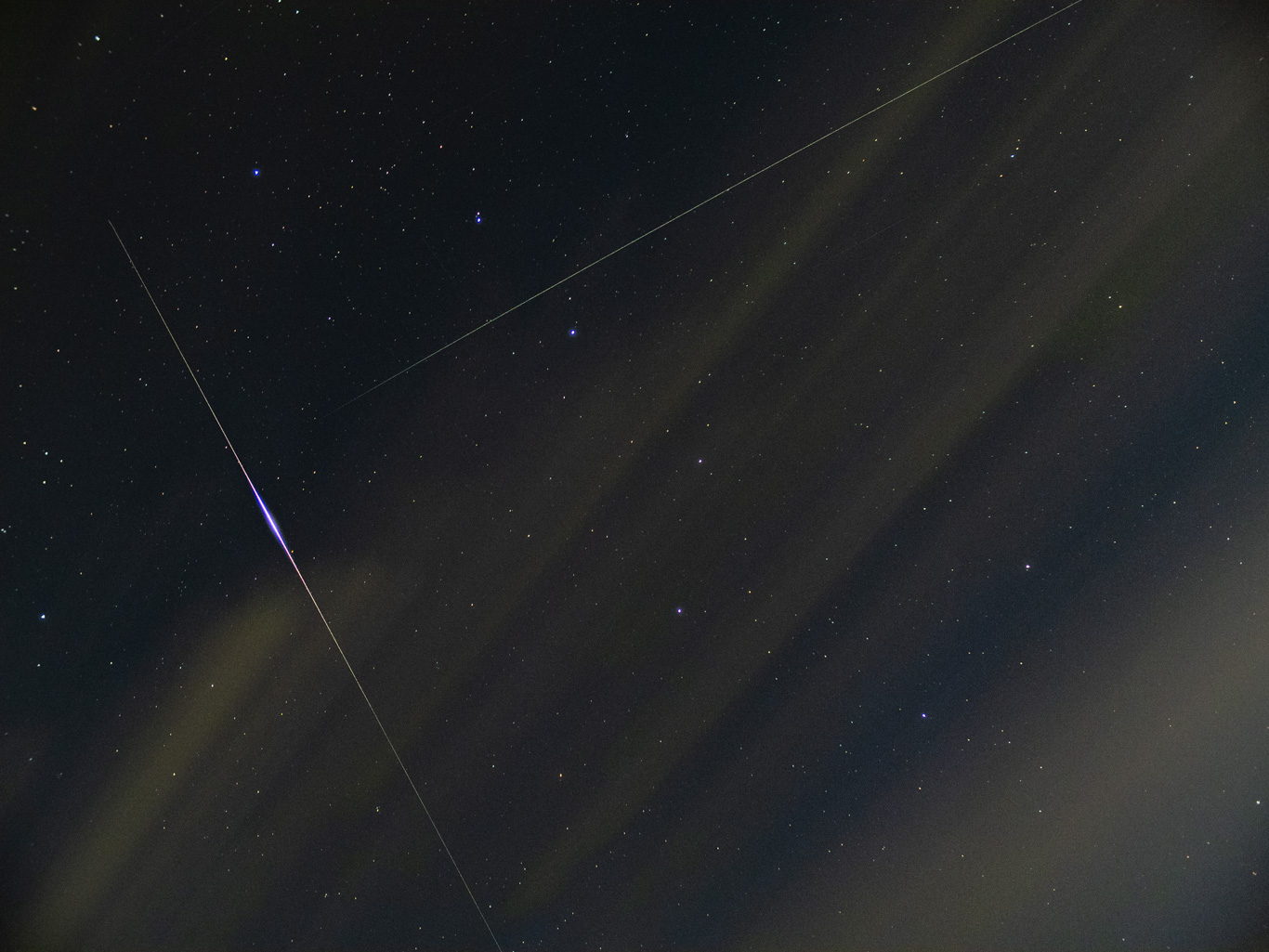 北斗七星と多すぎる人工衛星 2026.04.12 東の空が全く晴れず、パンスターズ彗星(C/2025 R3)の撮影は断念 ■ 北斗七星と多すぎる人工衛星 ■ 埼玉県飯能市 ■ 2026/4/12 3:35-3:46 ■ OLYMPUS OM-D E-M1 Mark III + NOKTON 25mm F0.95 ■ f:25mm/SS:1s/F2.0/ISO1600 ■ ライブコンポジット(約3-5分) ■ サイトロン ナノ・トラッカーで追尾撮影 □